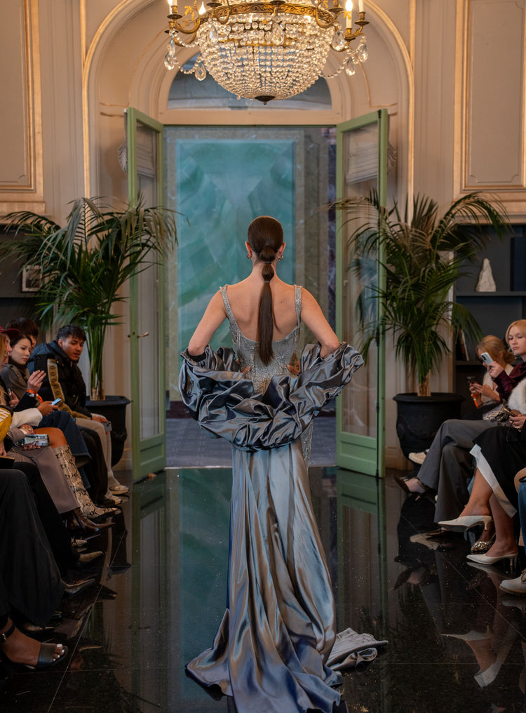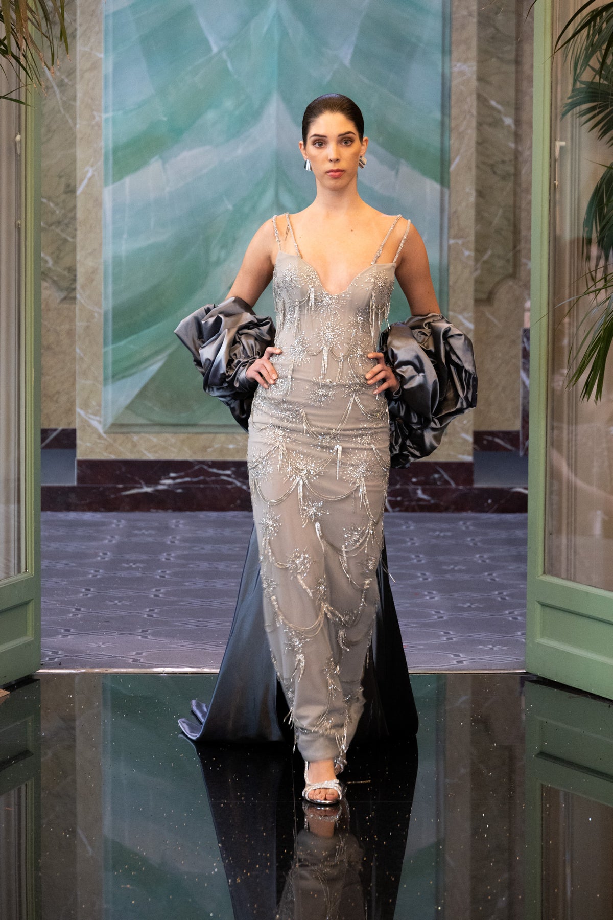 This glamorous silver gown is a masterpiece of couture craftsmanship, featuring handmade silver rhinestone embellishments intricately arranged to create a luminous, sculpted effect. The sleek silhouette is paired with a dramatic taffeta cape, adding volume and elegance to its striking design. Perfect for galas, red-carpet events, or elite evening affairs, this gown captures sophistication and allure in every detail.