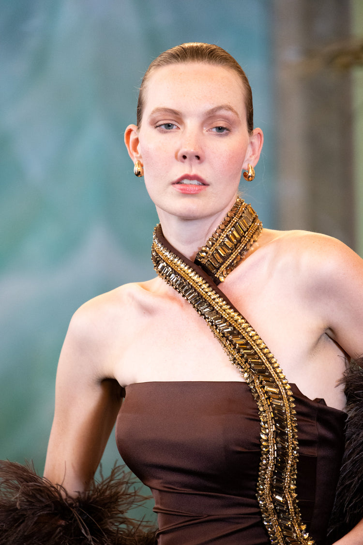 This exquisite gown in chocolate brown is a masterpiece of sophistication, featuring a satin and feather cape adorned with beaded golden rhinestones that glimmer with every movement. The structured bodice and asymmetric neckline exude confidence, while the rich satin fabric creates a smooth, elegant silhouette. A true statement piece for evening galas or high-fashion events, it embodies luxury and grace.