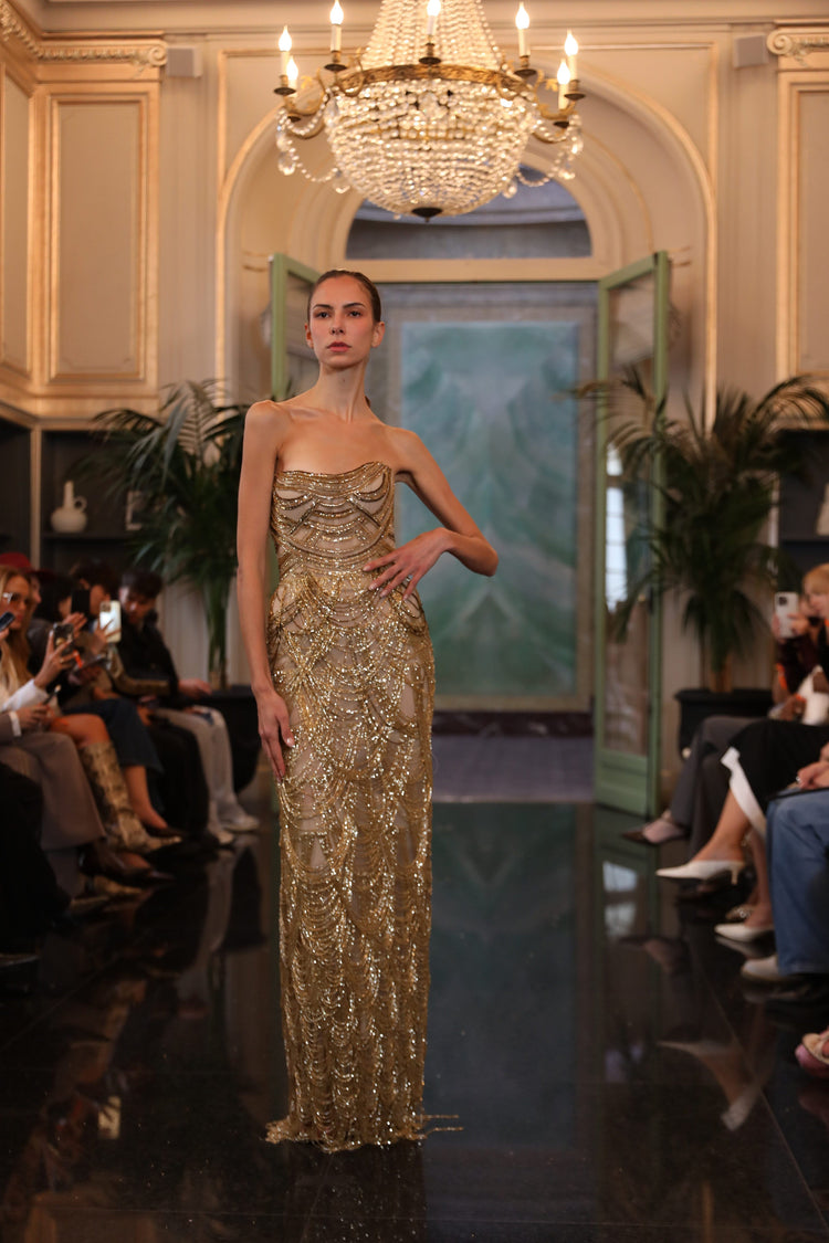 This captivating gown in golden chain radiates pure opulence, meticulously crafted with handmade golden chain embellishments that shimmer with every step. The sculpted silhouette embraces the body with precision, creating a fluid yet structured form that reflects light beautifully. A perfect fusion of art and couture, this gown is ideal for gala nights, red-carpet events, or any occasion where brilliance is the only option.