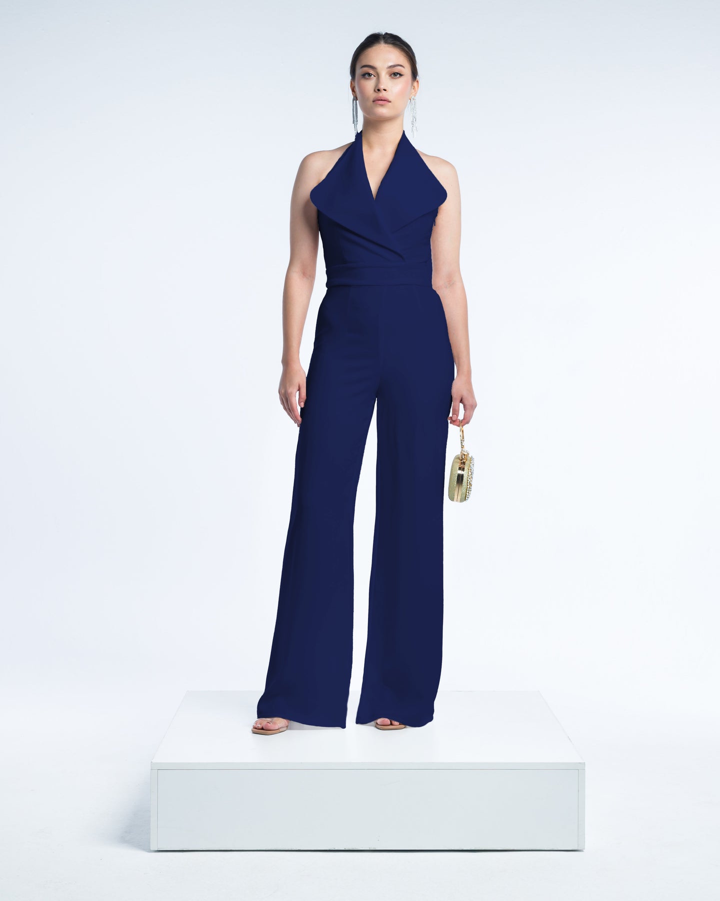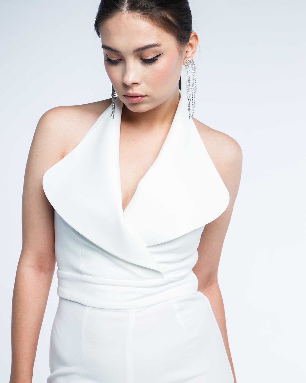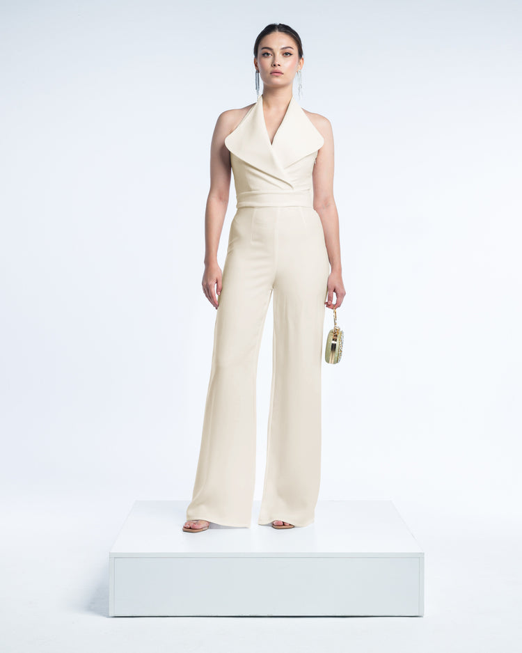 أفرول فاليريا هو تجسيد للأناقة العصرية والبساطة الراقية. يغمره لون أبيض نقي، ويتميز بتصميم فريد لياقة الهالتر التي تنساب برشاقة إلى حزام ملفوف يبرز جمال الجسم. تبرز السراويل الواسعة المتدفقة جاذبيته العصرية، مما يجعله قطعة مميزة لكل خزانة راقية.