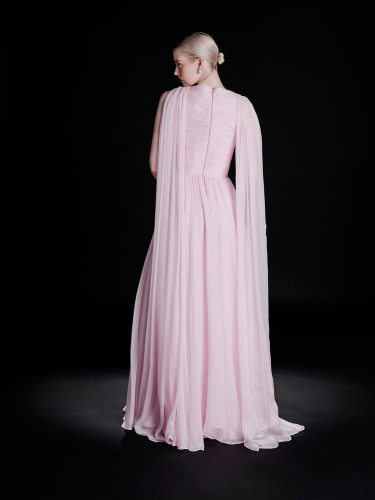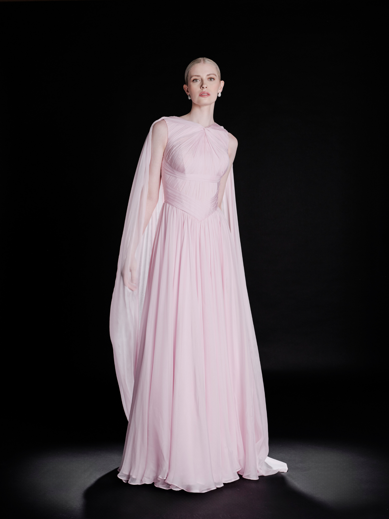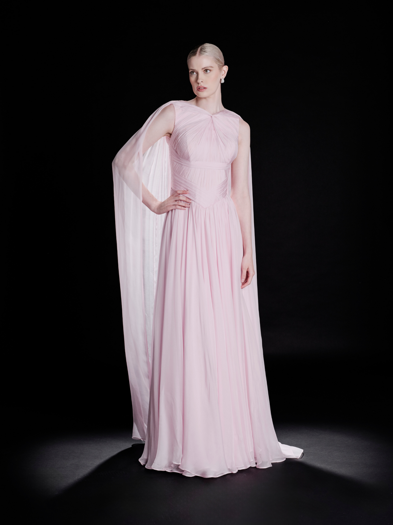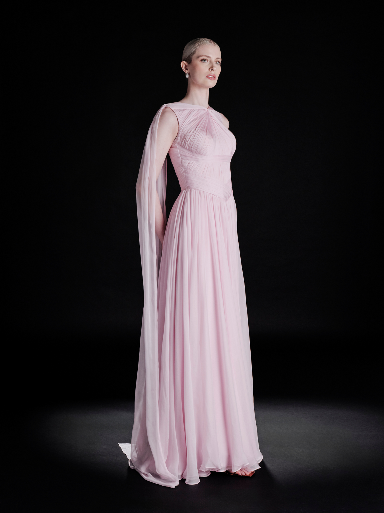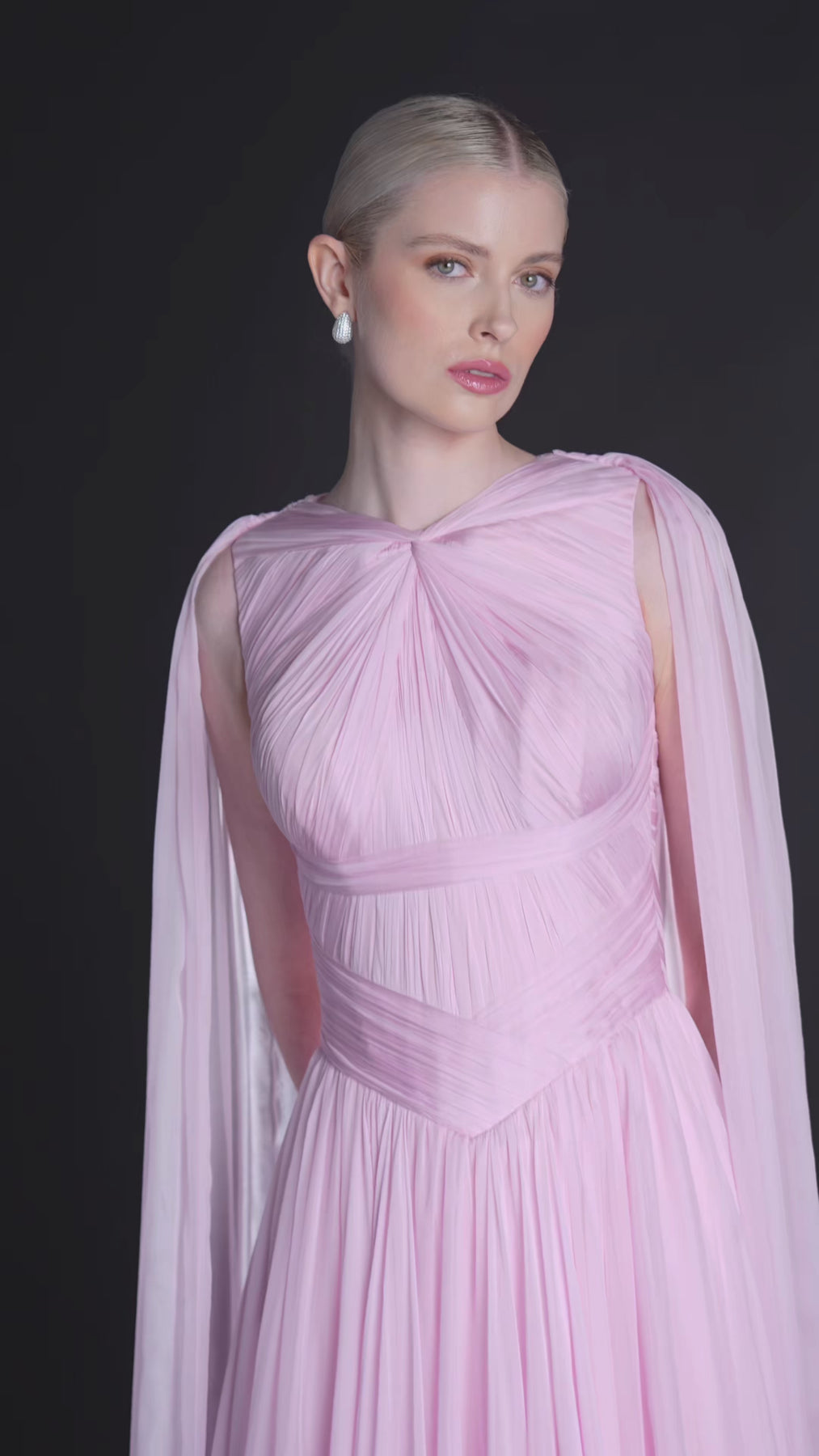 هذا الفستان المنسدل، الذي ينضح بالرقة والأنوثة، هو رؤيةٌ للأناقة العفوية. مصمم بكسرات رقيقة، وخصر مشدود، وقصة انسيابية، ليمنحكِ إطلالةً حالمةً وساحرة. ينسدل الكاب الشفاف ببراعة على الكتف، مما يضفي عليه سحرًا ملكيًا، ويجعله مثاليًا للمناسبات الخاصة، وحفلات السهرة، والمناسبات الرسمية.