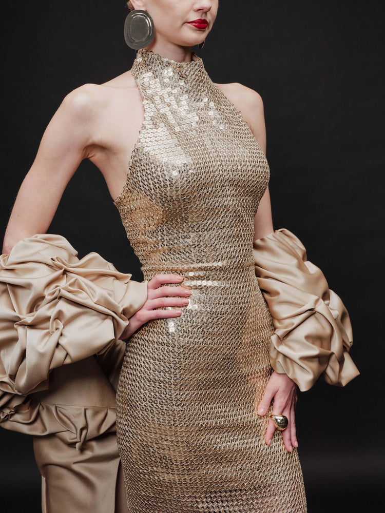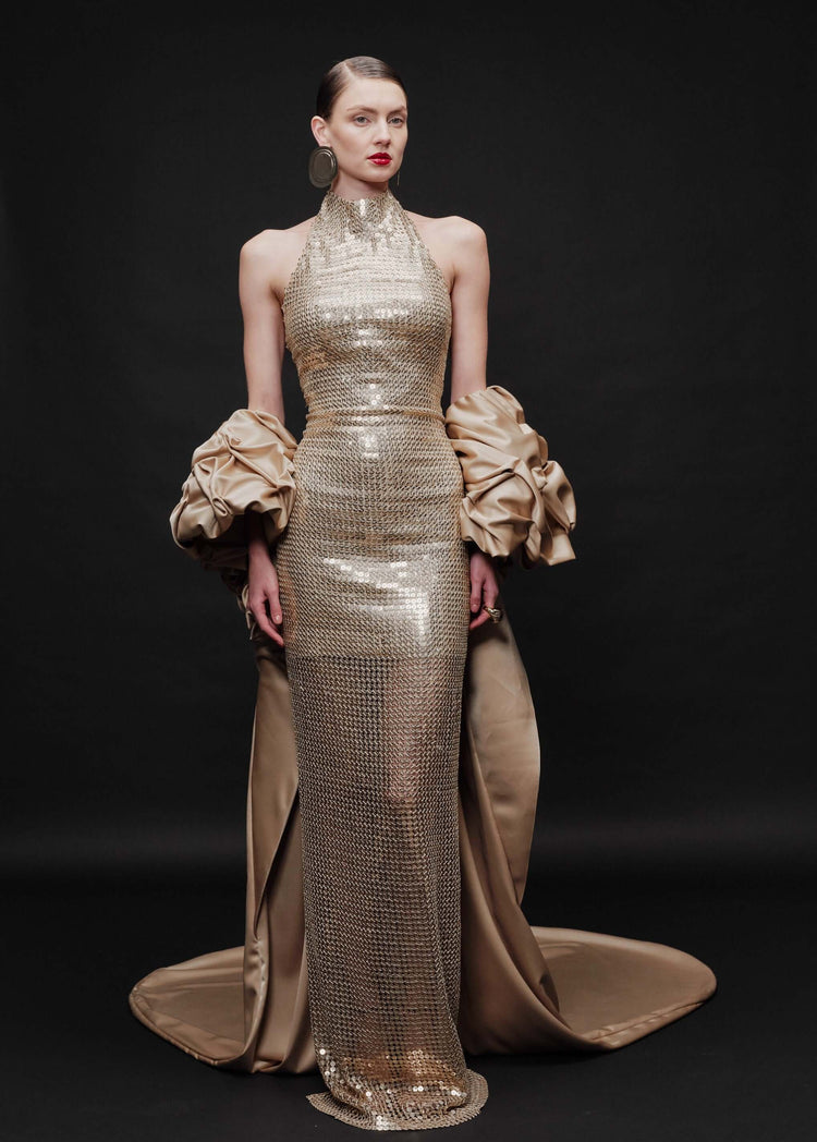 أظهري إطلالتك الجريئة مع هذا الفستان الذهبي الفاخر المزين بالترتر، والمصمم ليأسركِ بأناقته الخالدة. يتميز هذا الفستان بتصميم أنيق وضيق وياقة عالية بدون أكمام، مما يمنحكِ إطلالة عصرية ومتطورة. يتألق القماش المعدني المزين بالترتر بشكل رائع، مما يجعله مثاليًا لحفلات الجالا أو السجادة الحمراء أو المناسبات الخاصة. ولمزيد من الإثارة، يأتي الفستان بأكمام منفوخة كبيرة الحجم قابلة للفصل مصنوعة من الساتان الغني، مما يخلق جمالية مستوحاة من الأزياء الراقية. يكمل ذيل الفستان الساتان الرقيق المظهر بأناقة وفخامة.