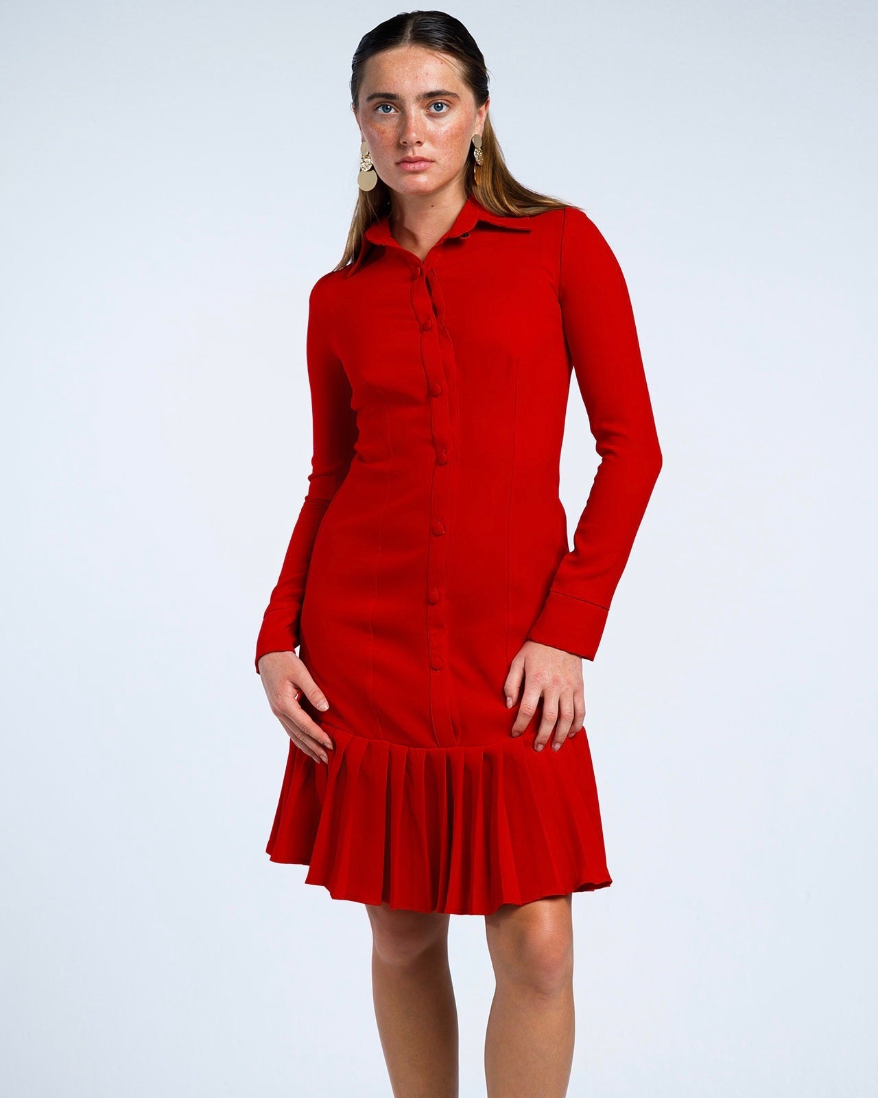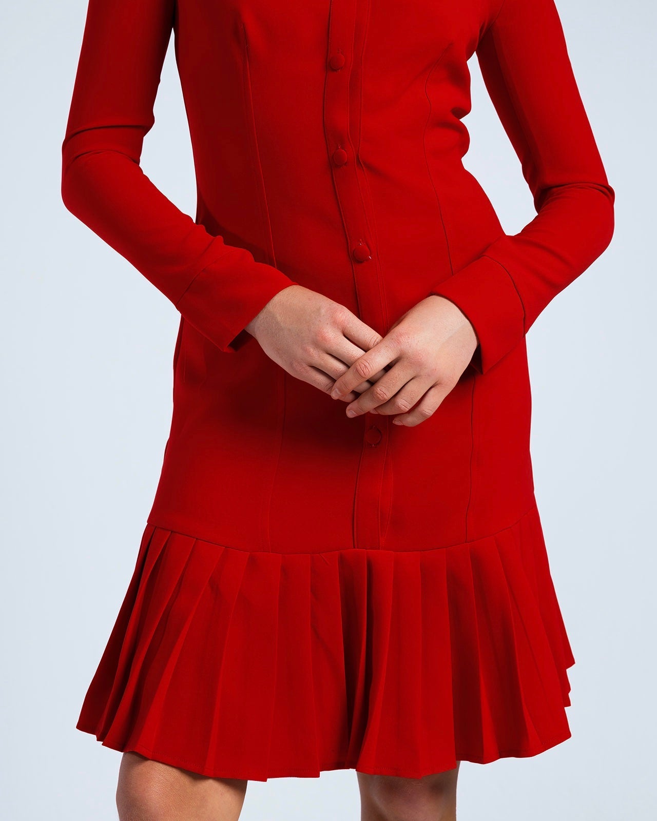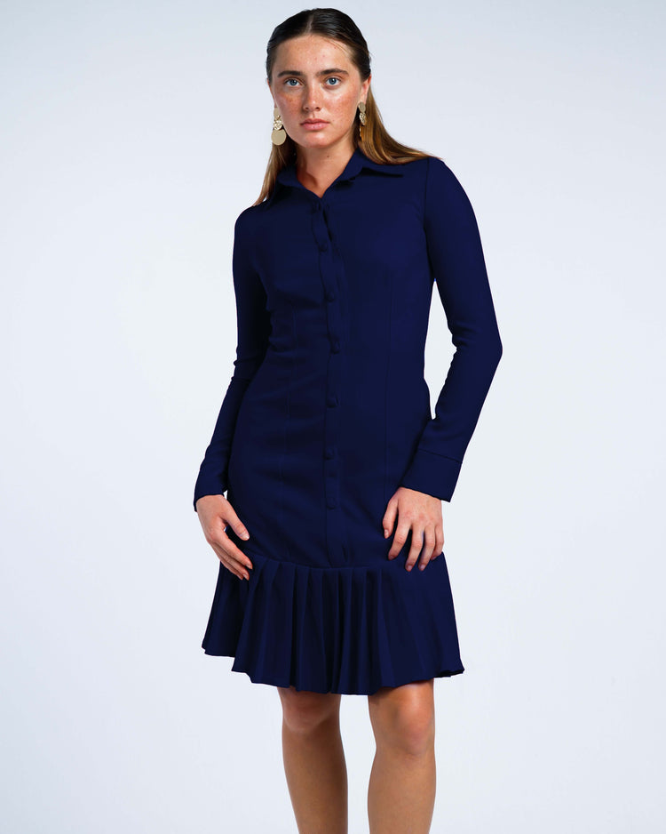 فستان إيريس ذو أكمام طويلة يجمع بين الجمال الكلاسيكي والحديث بتناغم. يتميز بلون أزرق داكن عميق يعكس الأناقة الرفيعة. تصميمه الدقيق يبرز الأزرار الموجودة في الأمام، مما يضيف لمسة من التقليد، في حين يضفي الحاشية المنفوخة المتموجة للأسفل لمسة عصرية، مما يضمن أن يبرز الشخص الذي يرتديه بأناقة وأناقة.