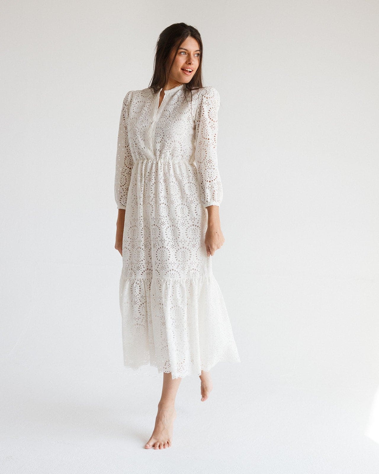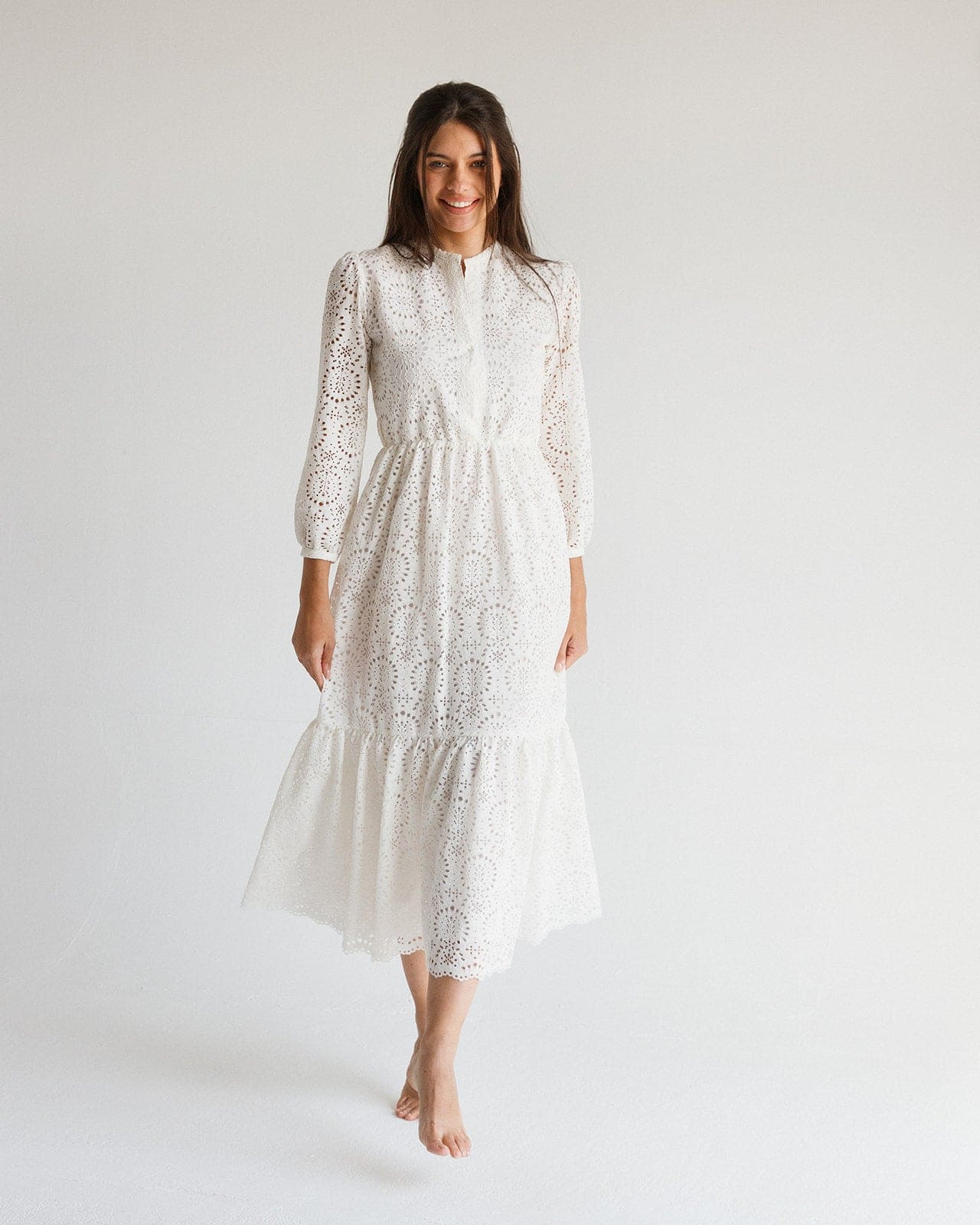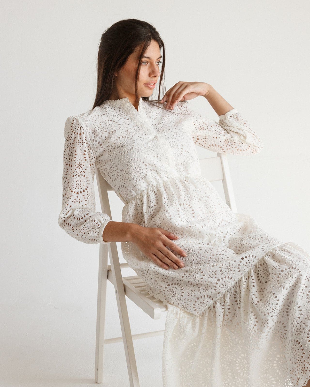 يجسد فستان الطويل الأبيض المطرز الأنيق الذي يشكل بالمواد الراقية بياضًا نقيًا ويعبق بسحر خالد. يتناغم قاعدته البيضاء النقية مع التفاصيل المطرزة المعقدة، التي ترسم أنماطًا ترقص عبر القماش. يبرز الفستان عنقًا متواضعًا مستديرًا مع شقة أمامية طفيفة، مع أكمام بالون كبيرة تضيف لمسة من الجاذبية الكلاسيكية. تصميم التدرج في الجيوبة يعزز حركة الفستان، مما يسمح له بالتدفق بأناقة مع كل خطوة. سواء كانت حفلة في الحديقة مع أشعة الشمس أو تجمع شاطئي مسترخي، يعتبر هذا الفستان إضافة متعددة الاستخدامات إلى كل خزانة ملابس.