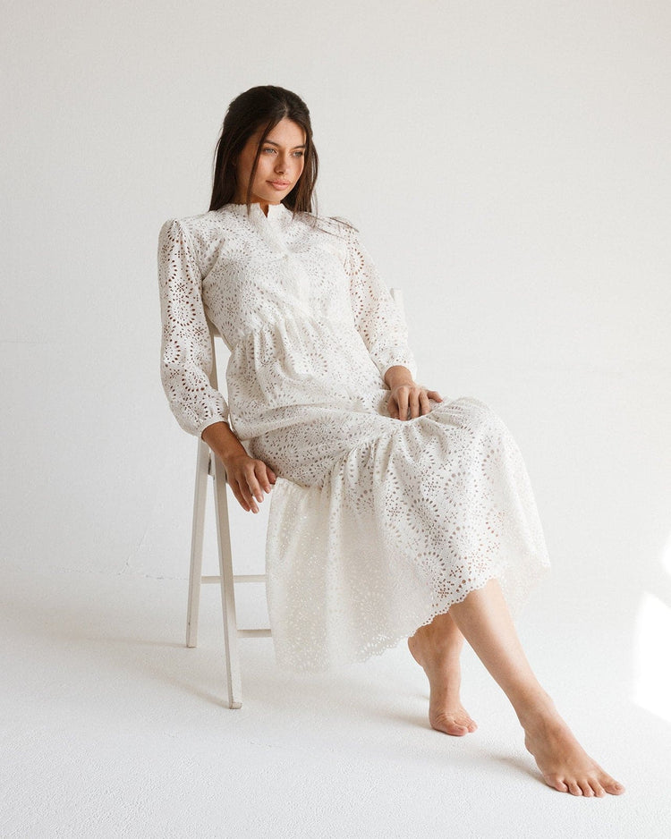 للحفاظ على التطريز الدقيق والبياض النقي للفستان، يُوصى بغسله يدويًا بالماء البارد باستخدام مسحوق غسيل لطيف. اتركيه مسطحًا ليجف بعيدًا عن أشعة الشمس المباشرة. تجنب استخدام المبيضات أو المواد الكيميائية القاسية. إذا لزم الأمر، استخدمي الكي بوضعية منخفضة، ووضع قطعة قماش بين الحديد والفستان لحماية التطريز.