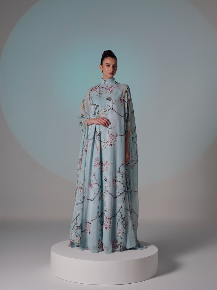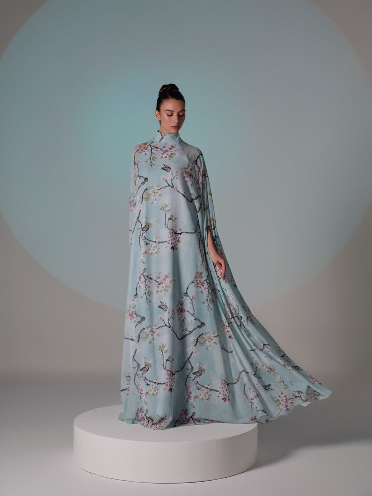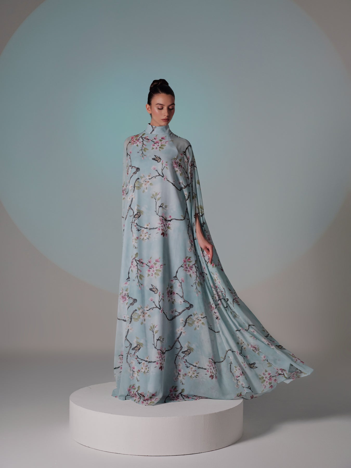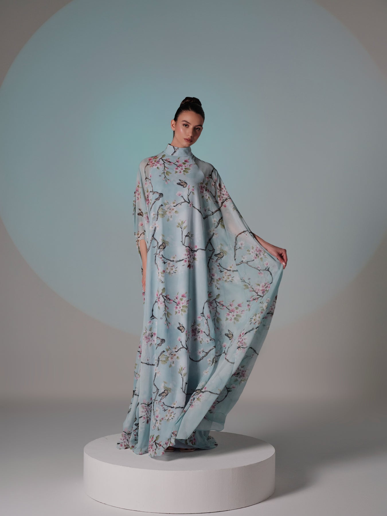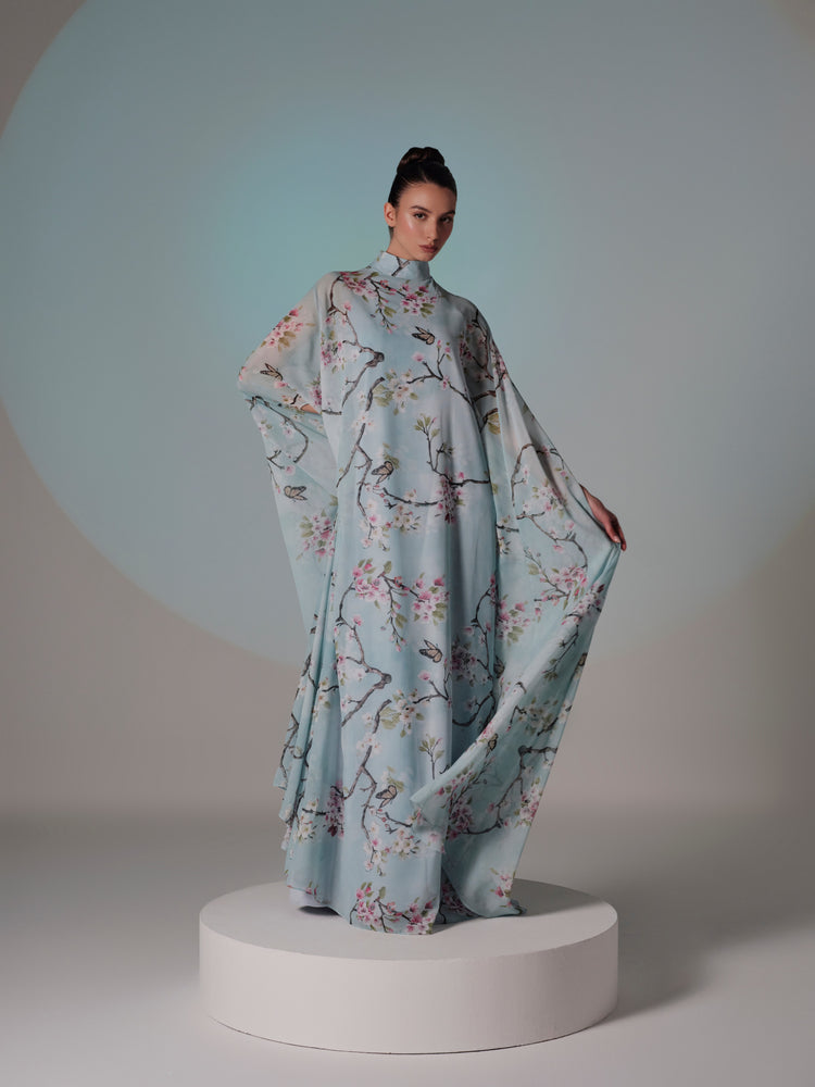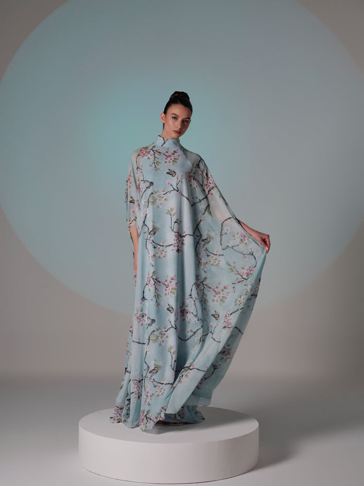 يتميز هذا الفستان الأزرق الرقيق بتصميم أنيق وانسيابي بنقوش زهرية متقنة، يضفي لمسة من جمال الطبيعة على القماش. ياقة عالية وأكمام واسعة وانسيابية تمنحه لمسةً من الأناقة والفخامة، بينما تُضفي التنورة الطويلة لمسةً من النعومة والانسيابية. مثالي للمناسبات الرسمية، يجمع هذا الفستان بين الرقي ولمسة من التألق، مما يجعله مثاليًا لمن تبحث عن قطعة مميزة.