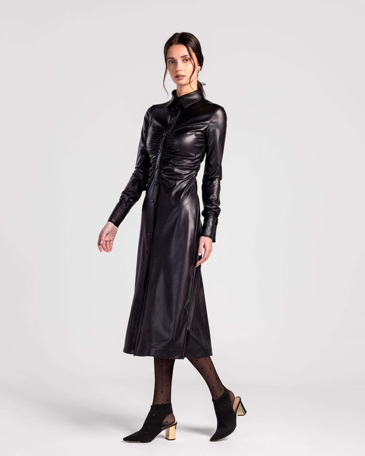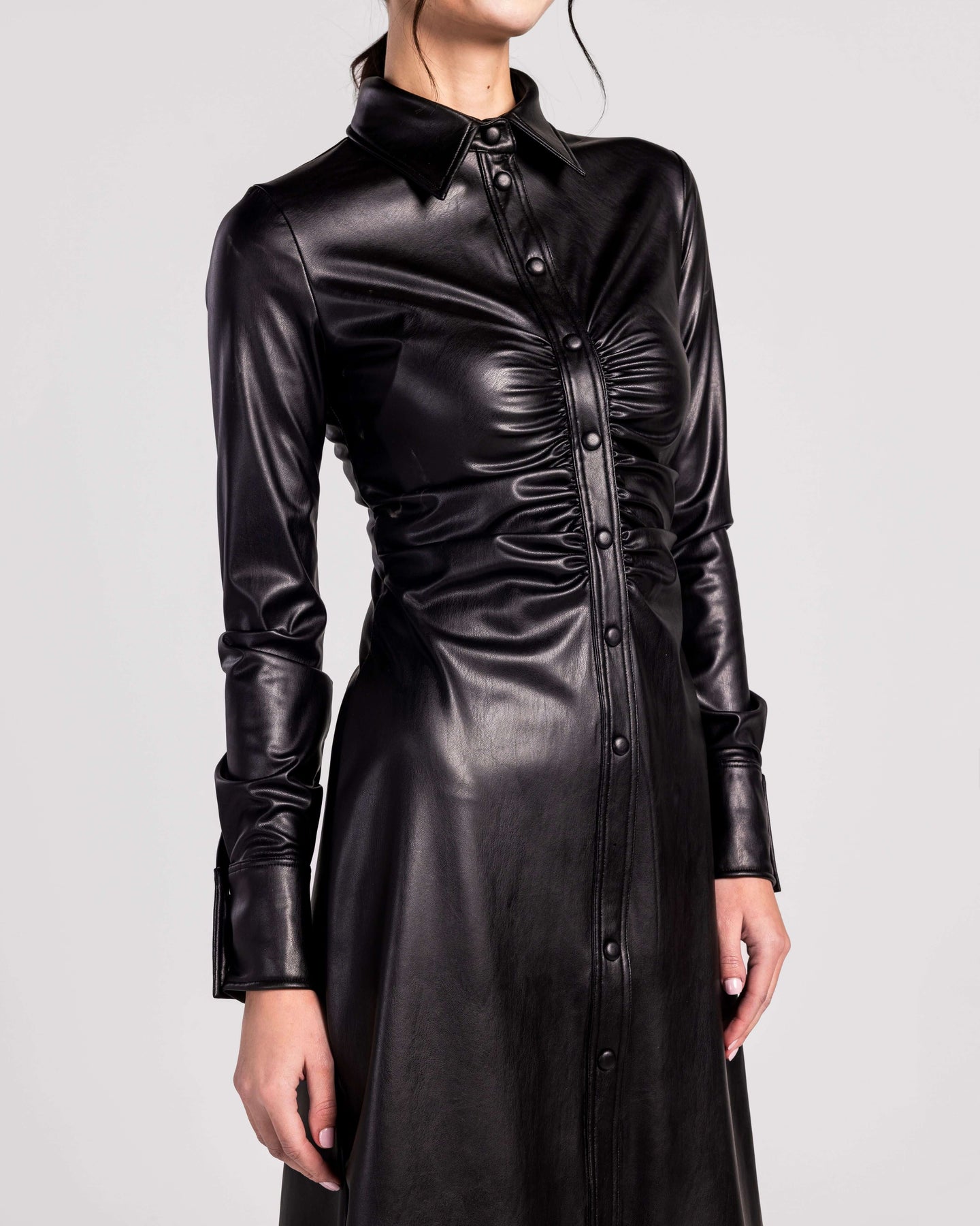- الفستان مصنوع من مادة جلدية فائقة الجودة، ويتميز بلمسة نهائية لامعة تخطف الأنظار. تم اختيار القماش لقدرته على محاكاة المظهر الفاخر للجلد الأصلي، مع توفير الراحة وسهولة الحركة أيضًا.