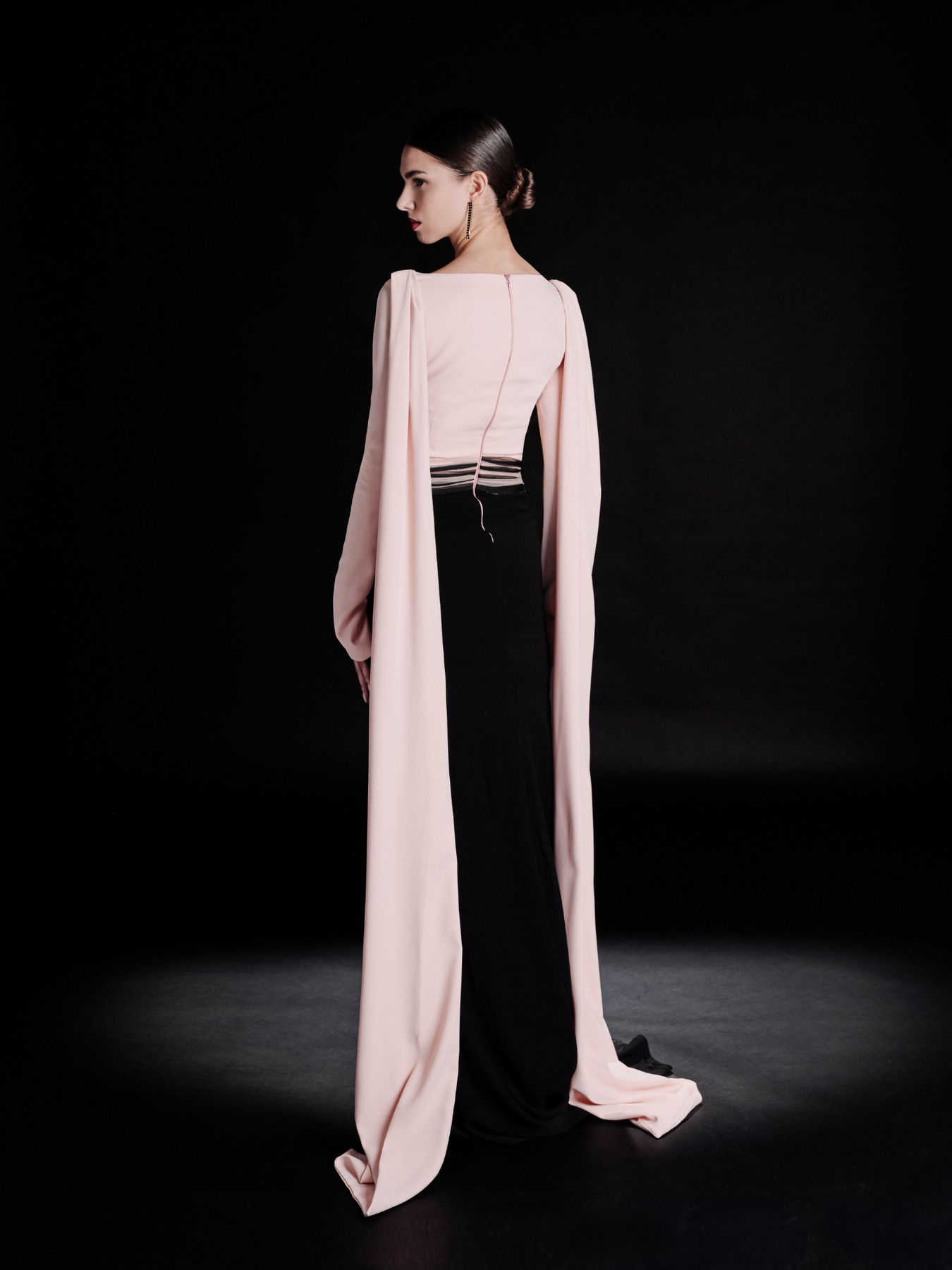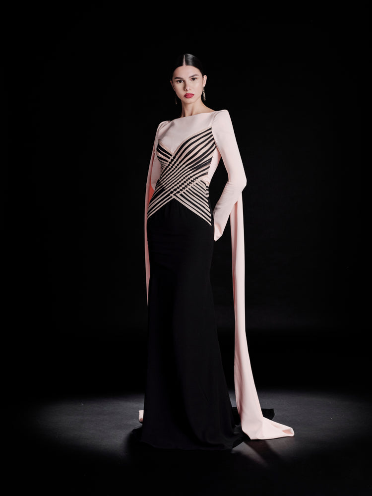 فستان سهرة باللونين الوردي والأسود، مزيج جريء من البنية والانسيابية، هو تعبير عن الأناقة العصرية. يتميز صد الكورسيه المنحوت بألواح هندسية معقدة، مما يخلق تباينًا مذهلاً يعزز الصورة الظلية. يضيف خط العنق المكشوف مع لمسات الكتف المنظمة لمسة ملكية، بينما تجلب الأكمام الطويلة الممتدة إلى الأرض حركة ودراماتيكية بدون عناء. تكمل التنورة السوداء الملائمة المظهر، مما يوفر جمالية خالدة ومعاصرة.