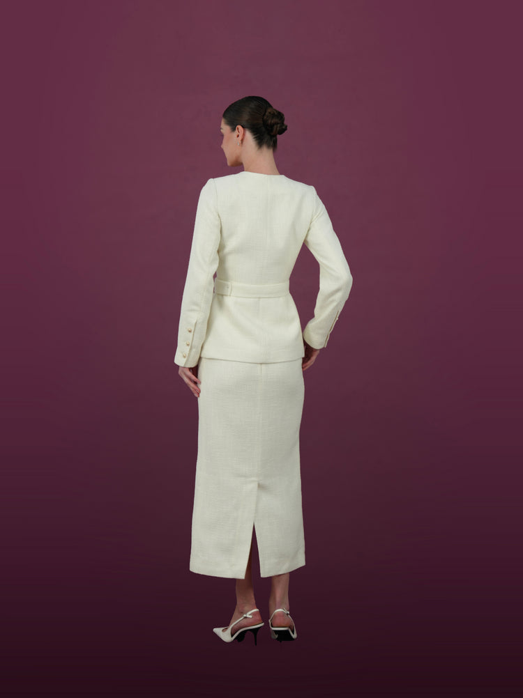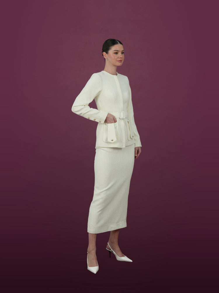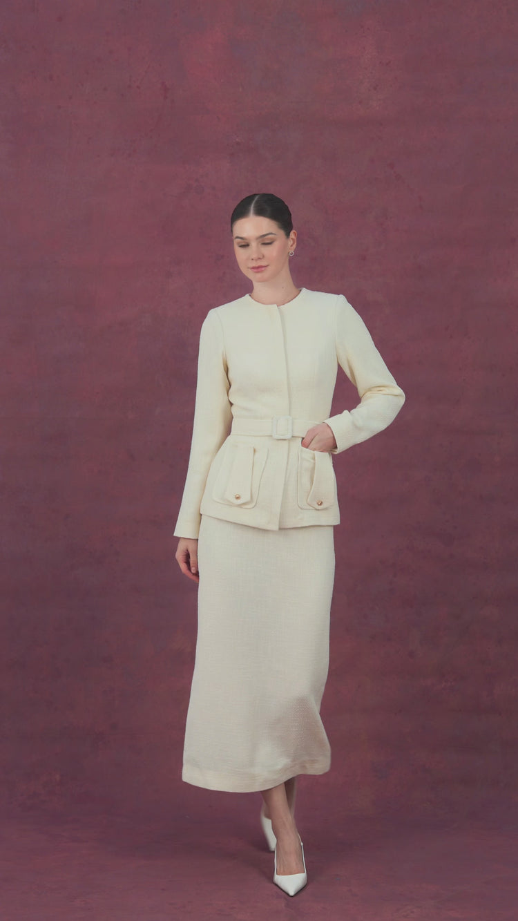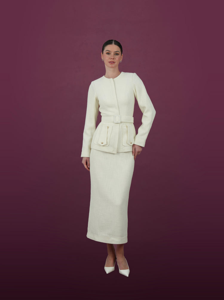 تتميز هذه المجموعة الكريمية الخالدة بجاكيت بحزام منقوش مع تنورة ميدي متناسقة. يتميز الجاكيت بتصميم منظم مع رقبة دائرية وسحاب أمامي للإغلاق وجيوب عملية بغطاء لمزيد من الأناقة. التنورة المتناسقة مصممة بإتقان، مما يمنحكِ إطلالة أنيقة وراقية، مناسبة للمناسبات الرسمية أو إطلالات النهار الأنيقة. هذه المجموعة مثالٌ للرقي والتنوع.