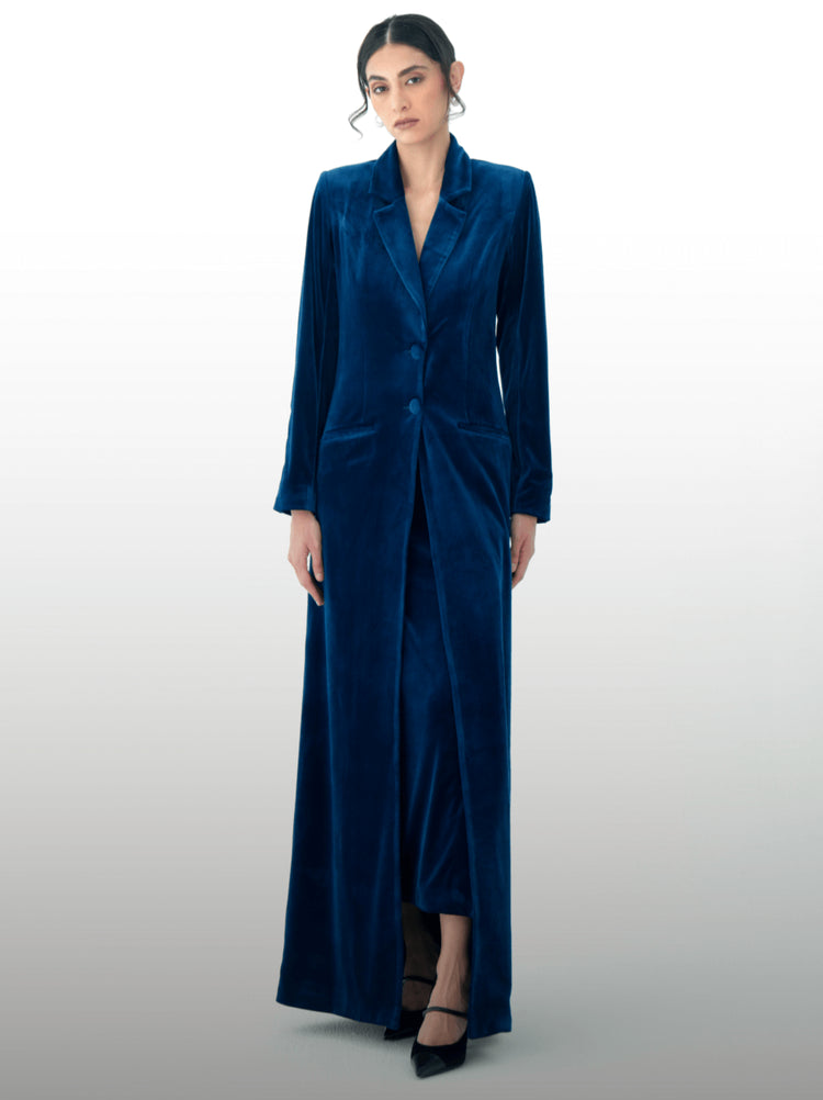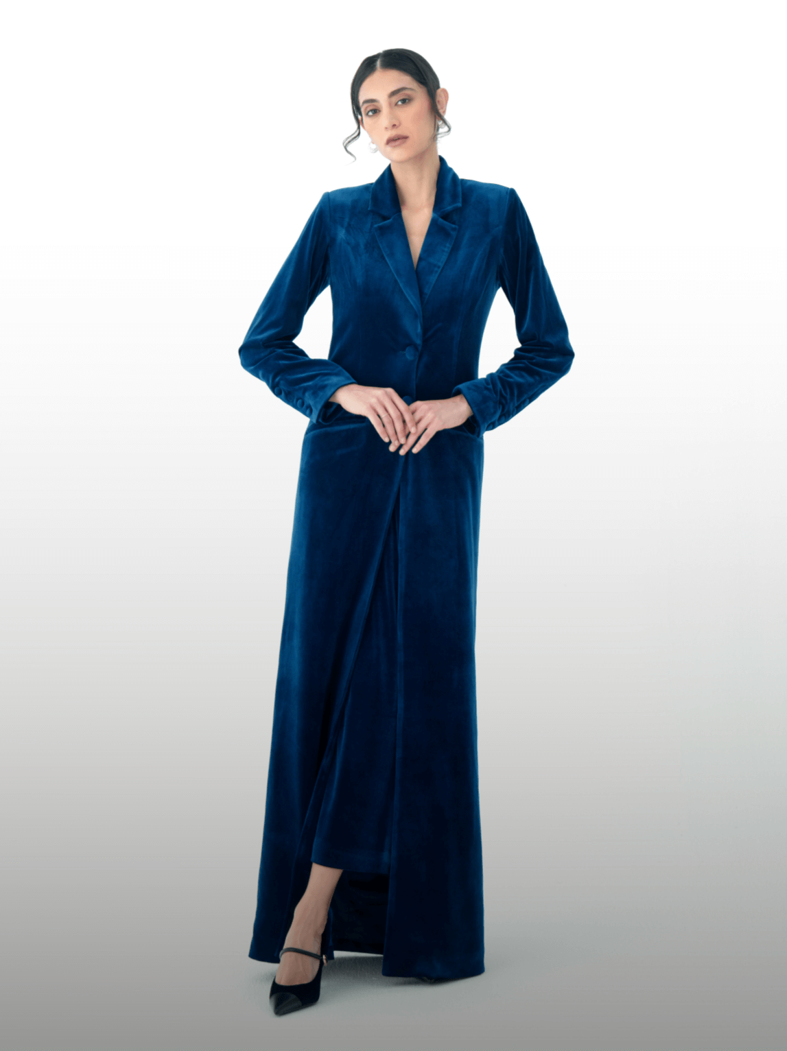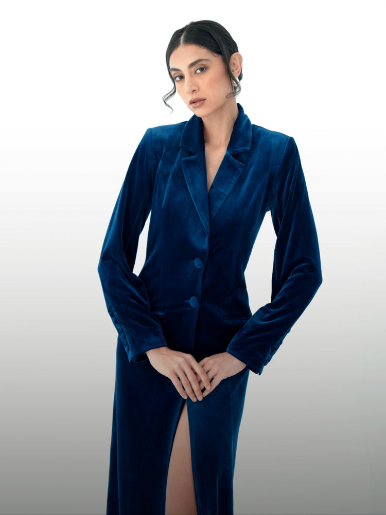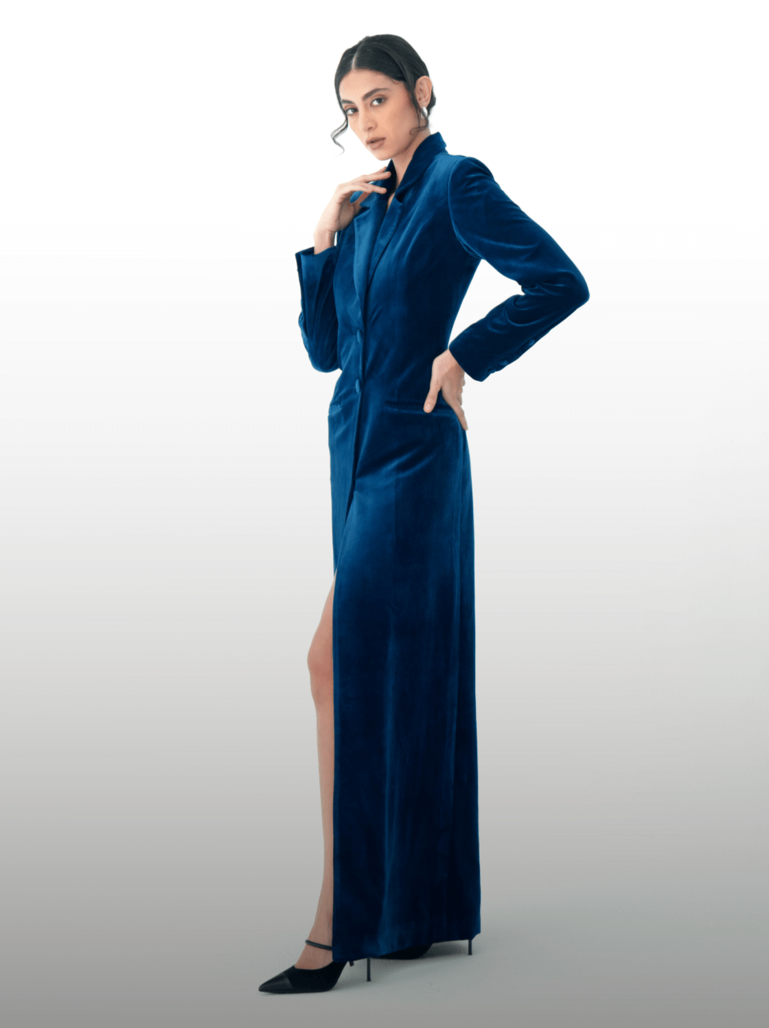 مصنوع من قماش مخملي فاخر، يتميز هذا الفستان البليزر بملمس فاخر مع لمعان مخملي ناعم ينضح بالفخامة. التصميم المصمم المستوحى من البليزر، المعزز بياقة واسعة وأكتاف منظمة، يخلق صورة ظلية جريئة وأنثوية. يحدد صدّاره الملائم الخصر بشكل جميل، بينما يضيف خط الحافة الطويل لمسة من السحر. الشق الجانبي الجريء يرفع التصميم، مما يوفر التوازن المثالي بين الأناقة والإثارة.