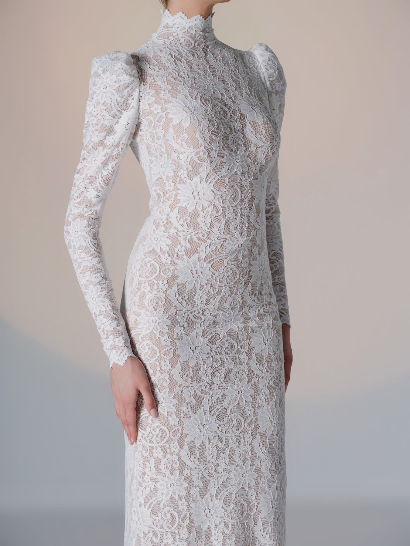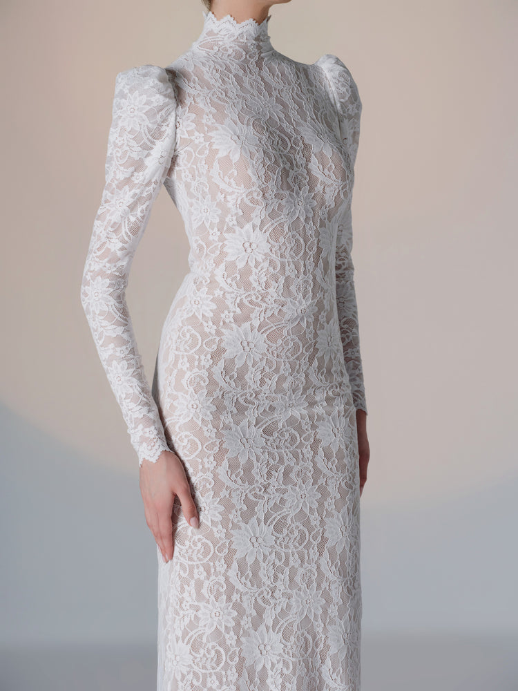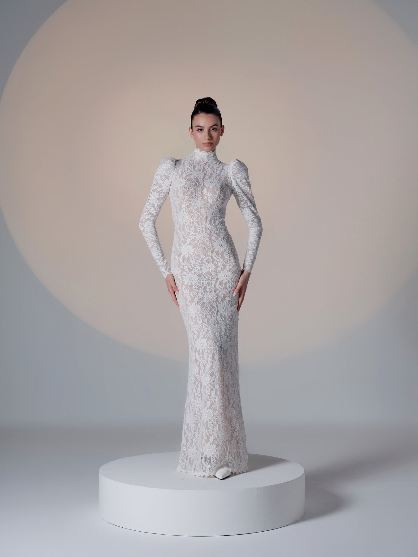 فستان سهرة أبيض رائع من الدانتيل يجمع بين الأناقة الكلاسيكية والطابع العصري. قماش الدانتيل الشفاف يعانق الجسم بجمال، مما يخلق مظهرًا أنثويًا جذابًا. تضفي الأكمام المنفوخة المثيرة وتصميم الرقبة العالية لمسة جريئة وعصرية، مما يجعله مثاليًا لأي شخص يرغب في لفت الأنظار في المناسبات الرسمية.