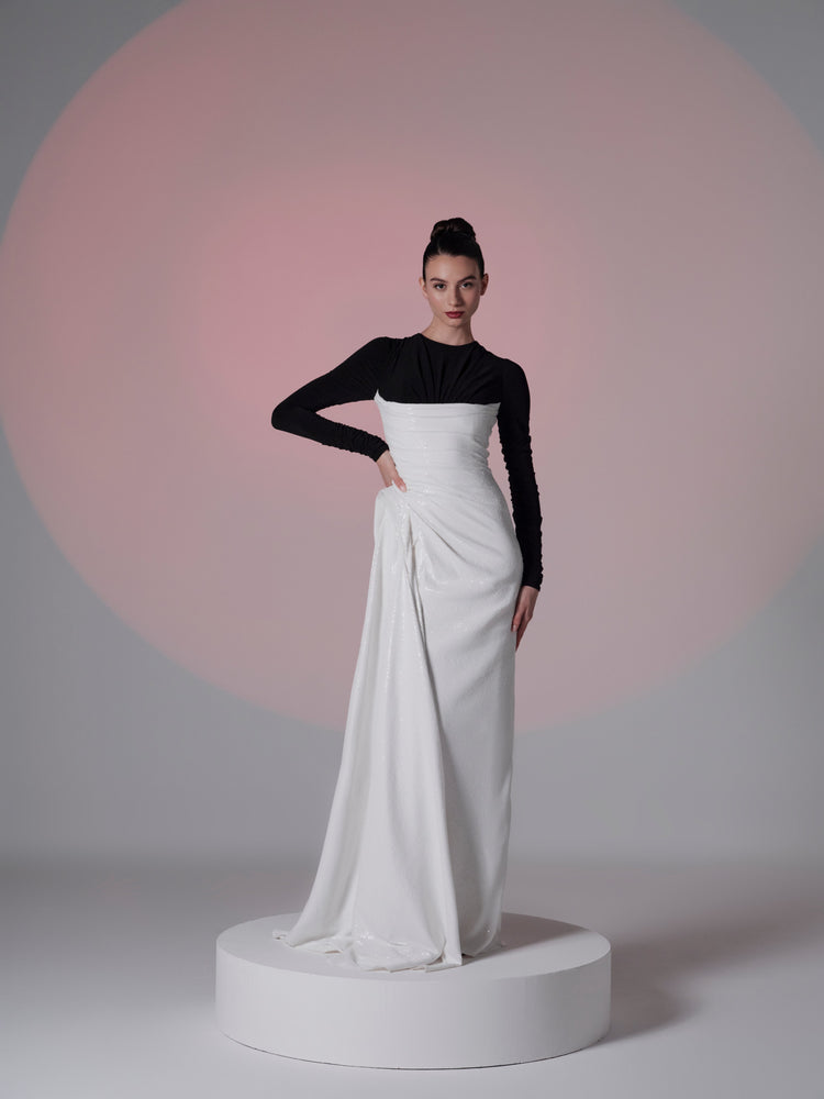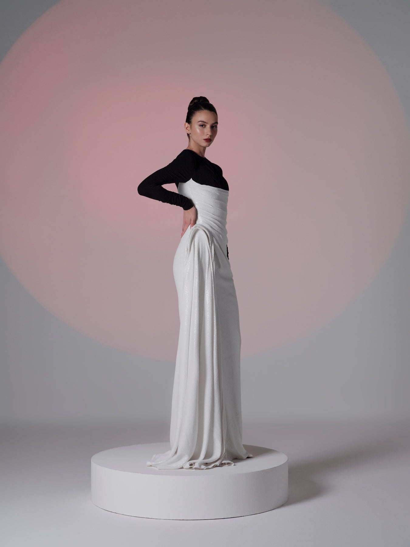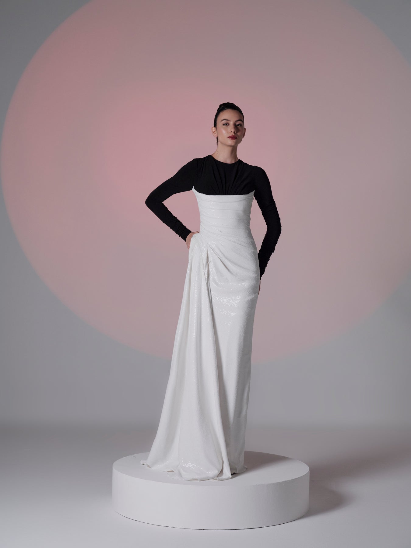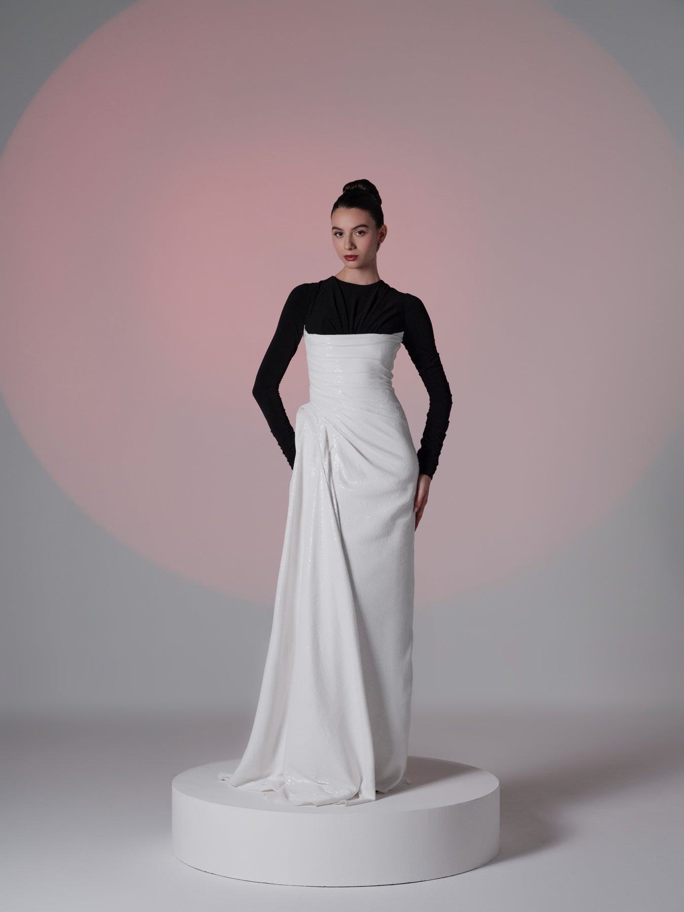 فستان سهرة فستان ليونور فستان اسود وابيض طويل بأكمام مزين بالترتر الرائع يجمع بين عناصر متباينة لإطلالة عصرية وأنيقة. يتميز الجزء العلوي بأكمام طويلة سوداء ضيقة مع فتحة رقبة منسدلة، تتحول بسلاسة إلى تنورة بيضاء مرصعة بالترتر ملفوفة تضفي عليه لمسةً من الأناقة. يُضفي الثني الفريد على التنورة لمسةً من الجمال والتناسق، مثاليةً لمناسبات السهرة التي تتطلب إطلالةً راقية وجريئة.