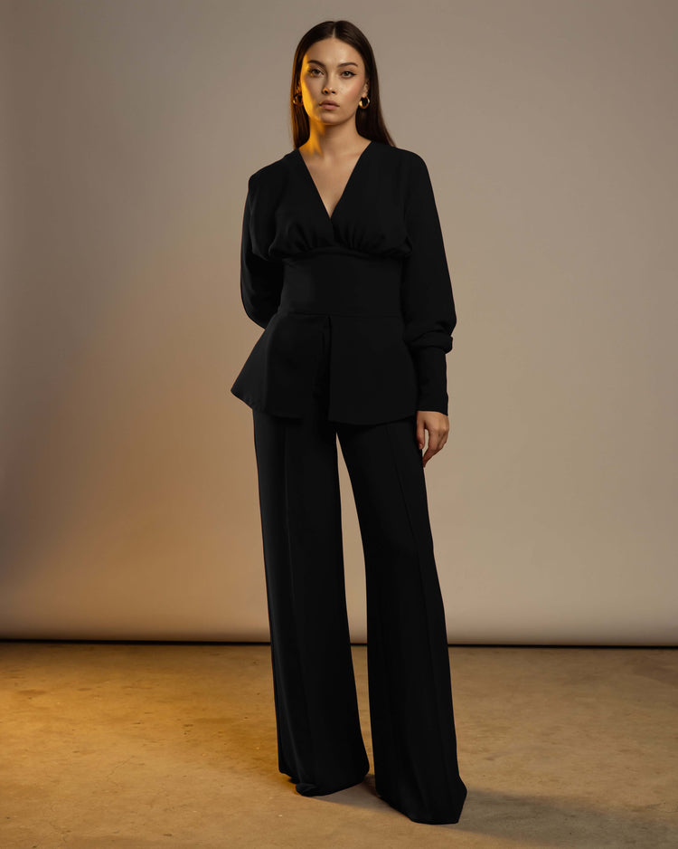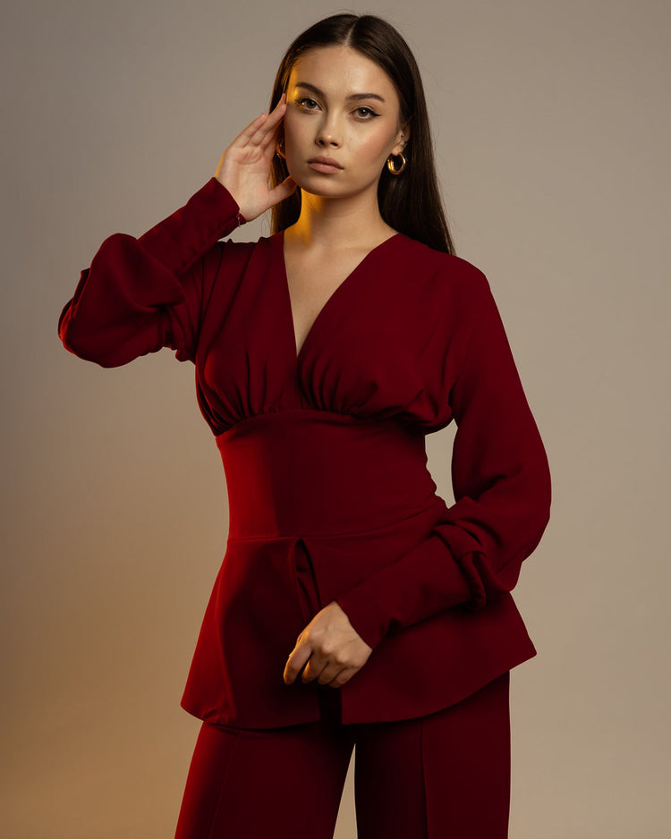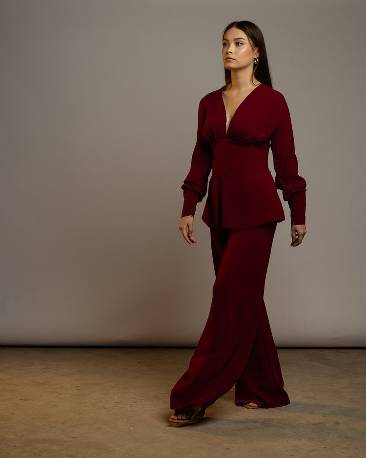 تمثل بدلة فيرا تجسيدًا للتصقل المعاصر. يتميز لونها البورجوندي العميق بتصميم يبرز الخصر المشدود والتفاصيل المتقنة للتجعيد عند الصدر. بينما توفر الفتحة العميقة في العنق لمحة من الجرأة، يتم توازنها بوسامة التصميم بشكل عام. يضيف عنصر التنورة إلى البدلة طبقة إضافية من العمق، متناقضًا بشكل مثالي مع السراويل الواسعة الساقين طول القامة.