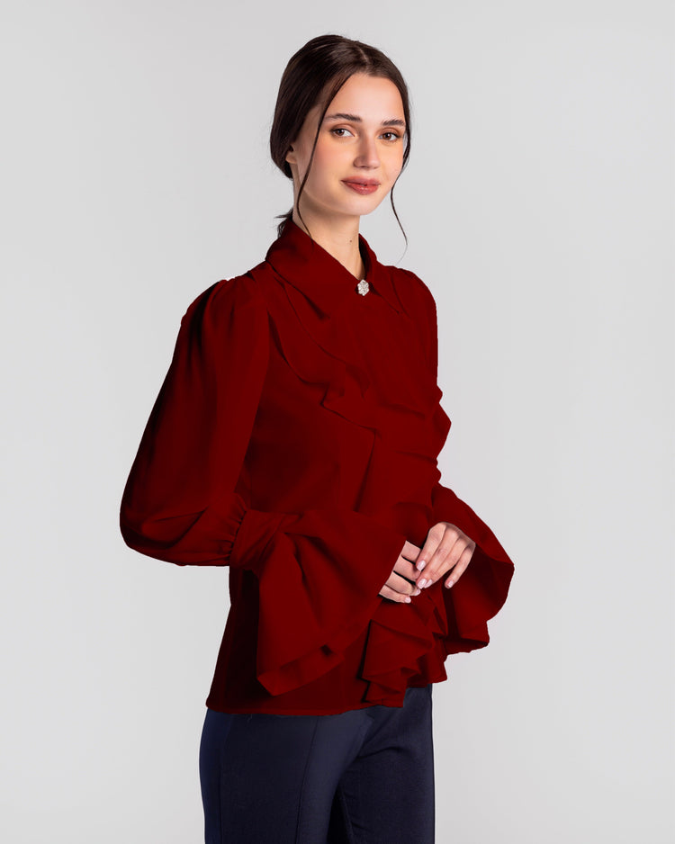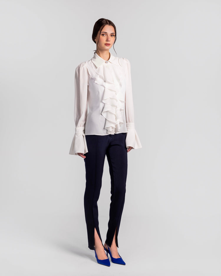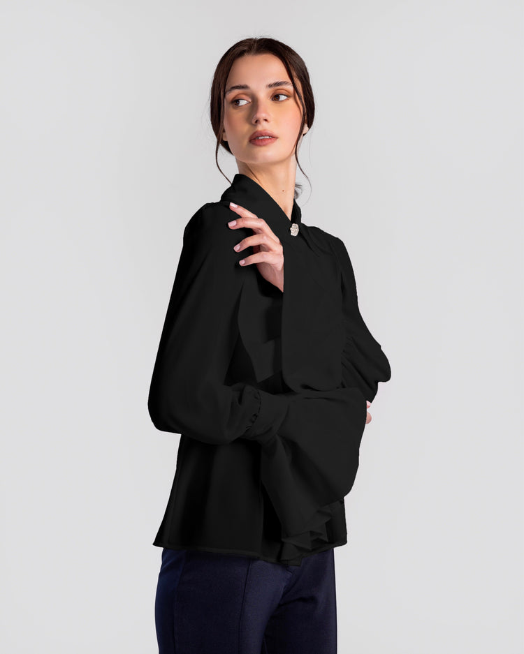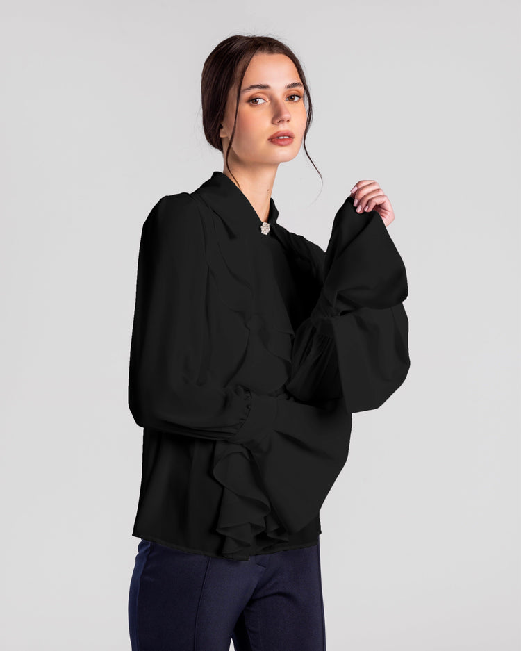 Discover the epitome of sophistication with our "Elegance Refined Blouse." Designed for the modern woman, this blouse exudes a timeless grace that transitions seamlessly from office attire to evening elegance. The blouse features a delicate ruffle detail along the collar, adding a touch of femininity to its classic silhouette. The luxurious chiffon fabric drapes gracefully, offering a flattering fit for all body types.