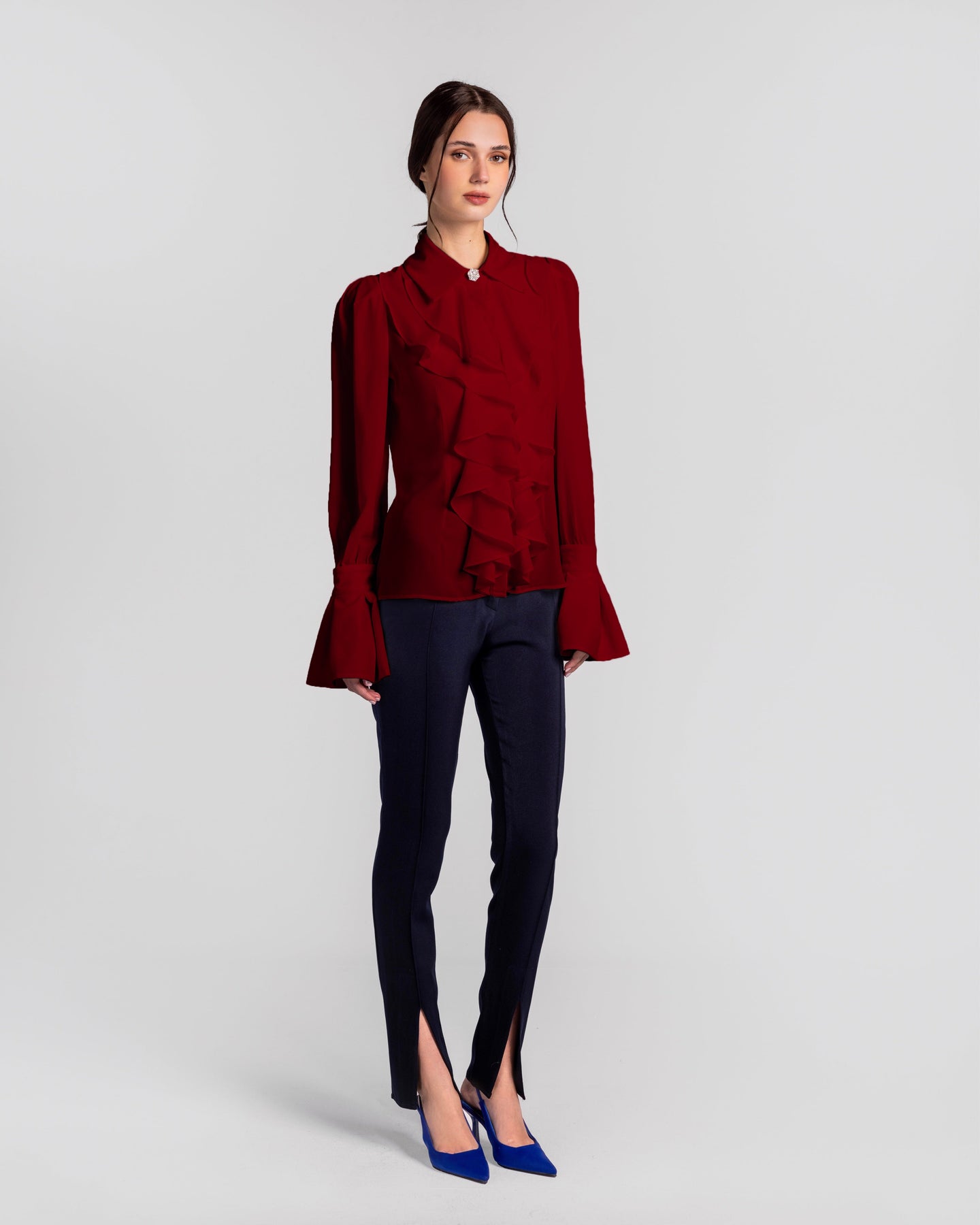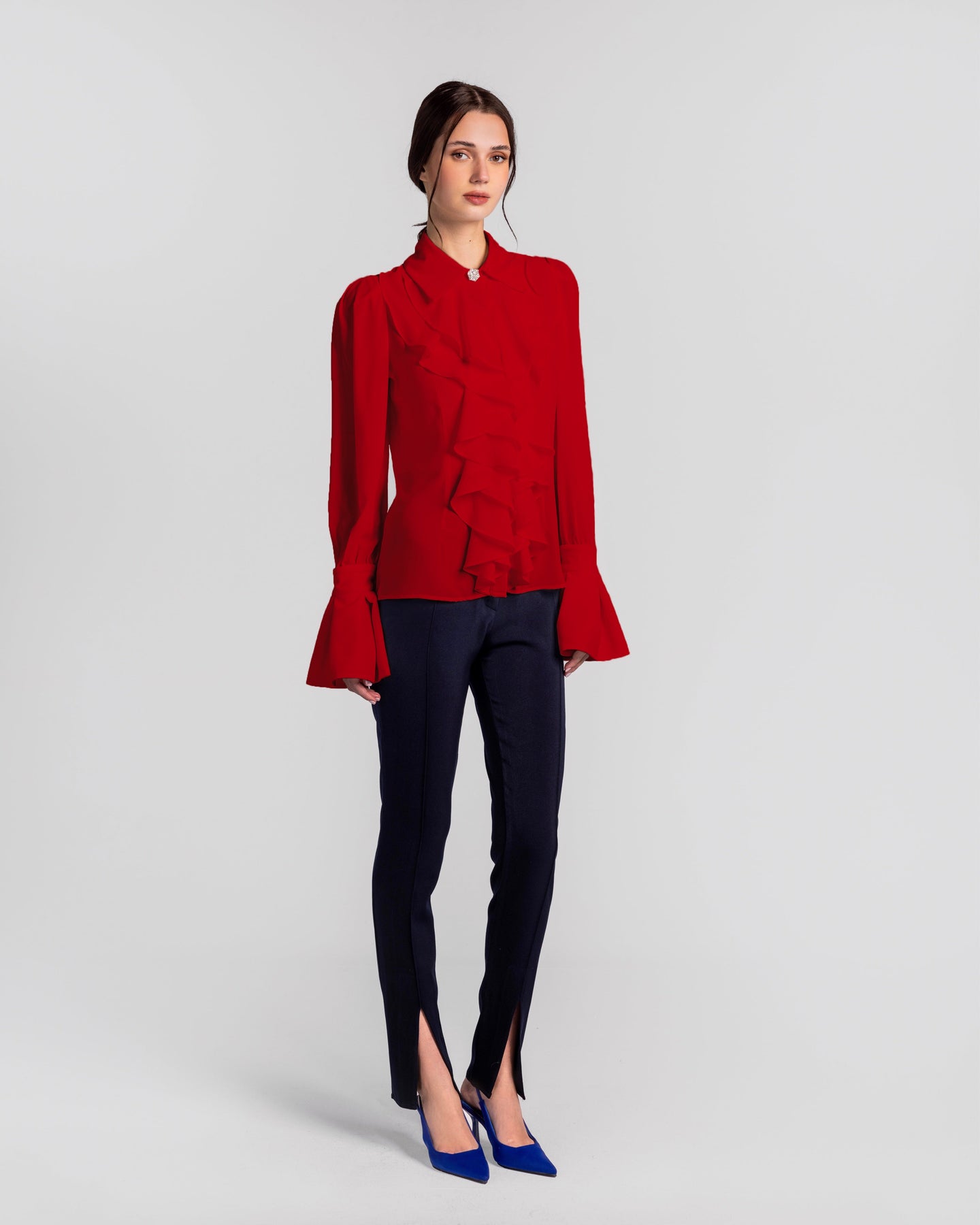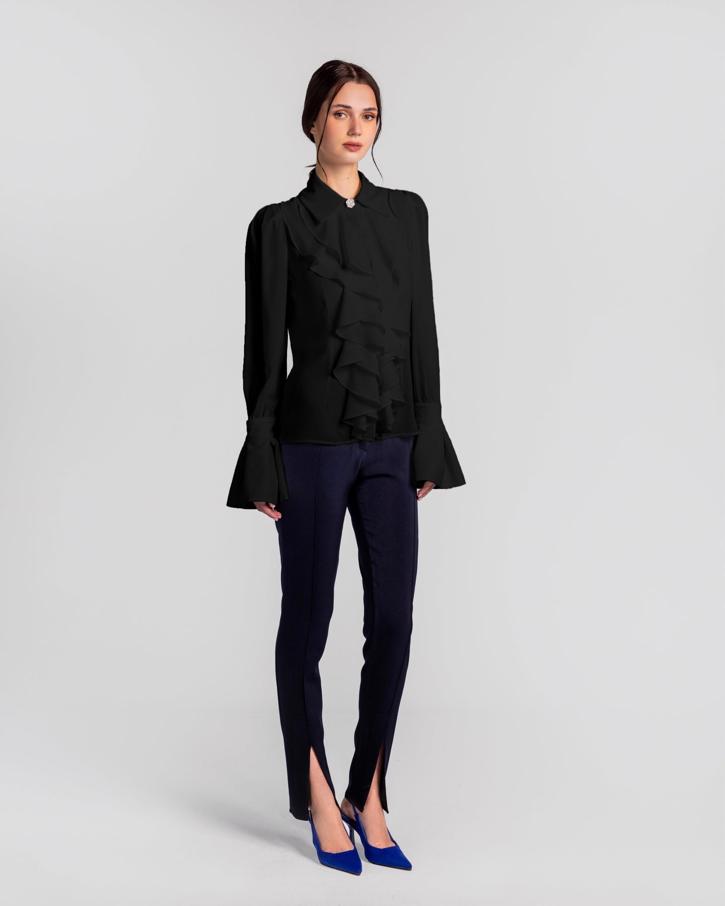 Discover the epitome of sophistication with our "Elegance Refined Blouse." Designed for the modern woman, this blouse exudes a timeless grace that transitions seamlessly from office attire to evening elegance. The blouse features a delicate ruffle detail along the collar, adding a touch of femininity to its classic silhouette. The luxurious chiffon fabric drapes gracefully, offering a flattering fit for all body types.