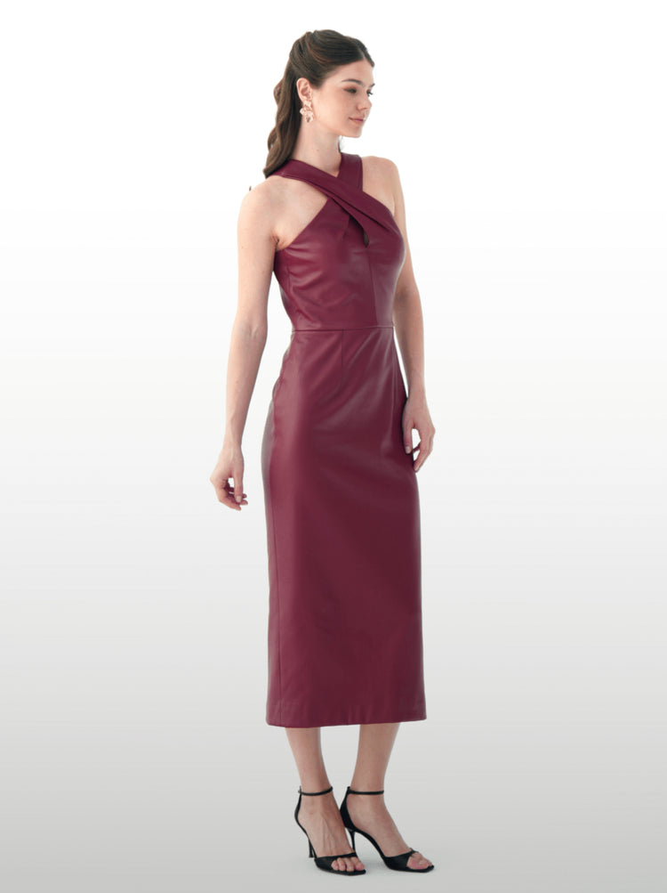 Designed with a unique halter neckline, the crossover detailing gracefully wraps around the neck, drawing attention to the shoulders and collarbone. The fitted bodice sculpts the waist for a flattering silhouette, while the midi-length skirt offers a refined, streamlined finish that enhances the figure.