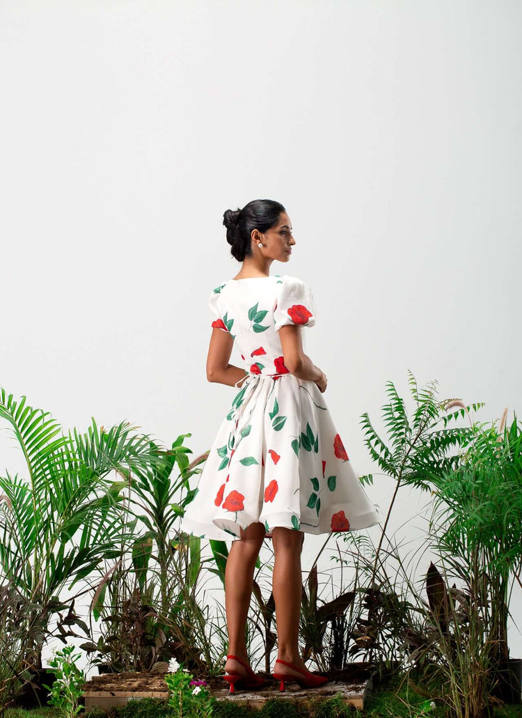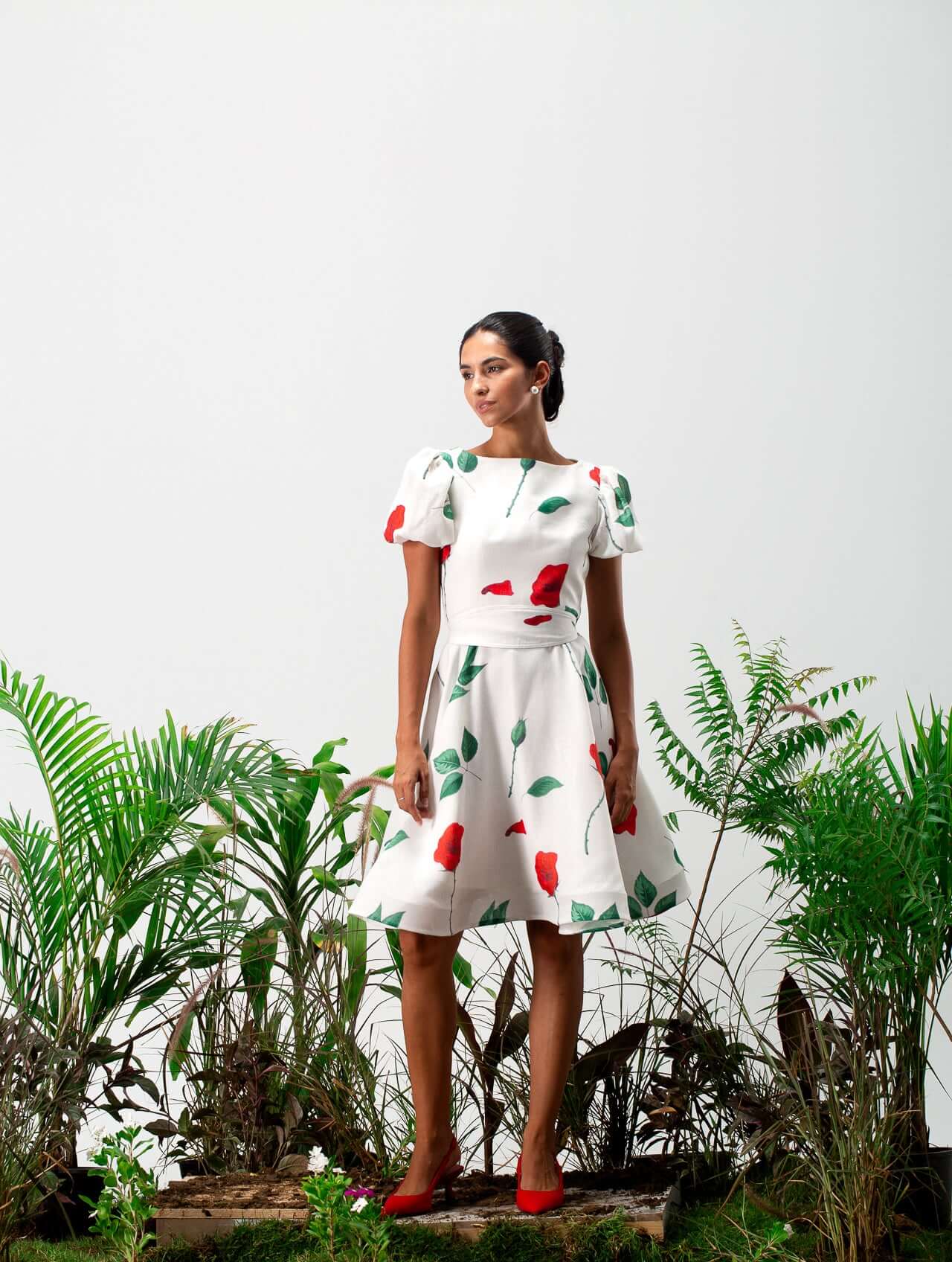 This mini dress showcases a minimalistic yet bright floral print. Its sophisticated boat neckline and short balloon sleeves offer a touch of classic charm, while the cinched waist with a delicate belt detail enhances your figure. The volume's ballerina skirt flows gracefully to the knee, merging timeless style with a contemporary twist for a look that's both elegant and modern.