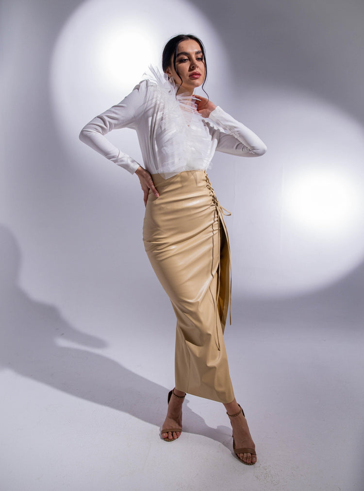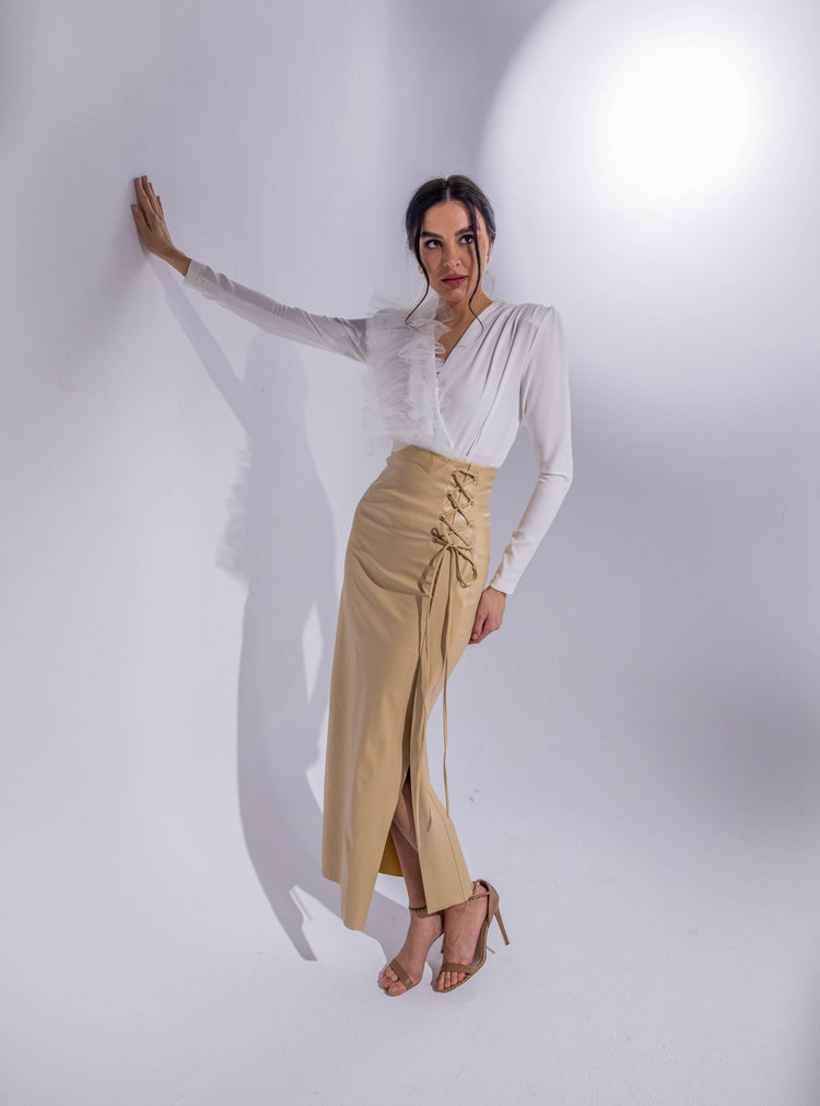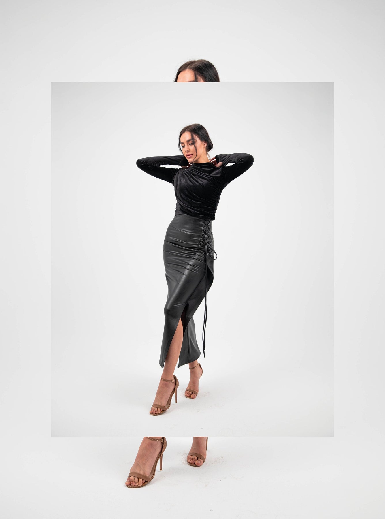 FAUX LEATHER DRAWSTRING SPLIT FRONT