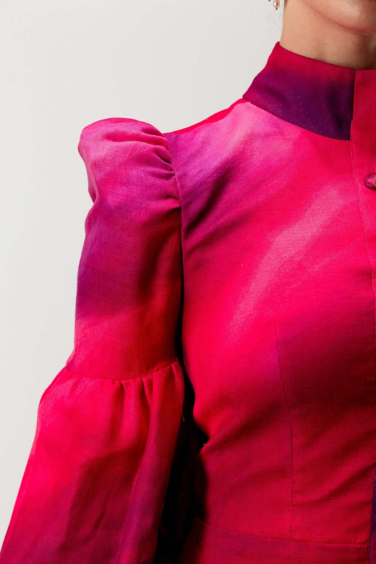 This gradient pink dress has a unique silhouette that creates an unforgettable impression. The straight shape skirt flows gracefully, complementing the fitted chest for a flattering silhouette. A high neckline and standing collar add a touch of sophistication, making this dress perfect for both formal and casual occasions.